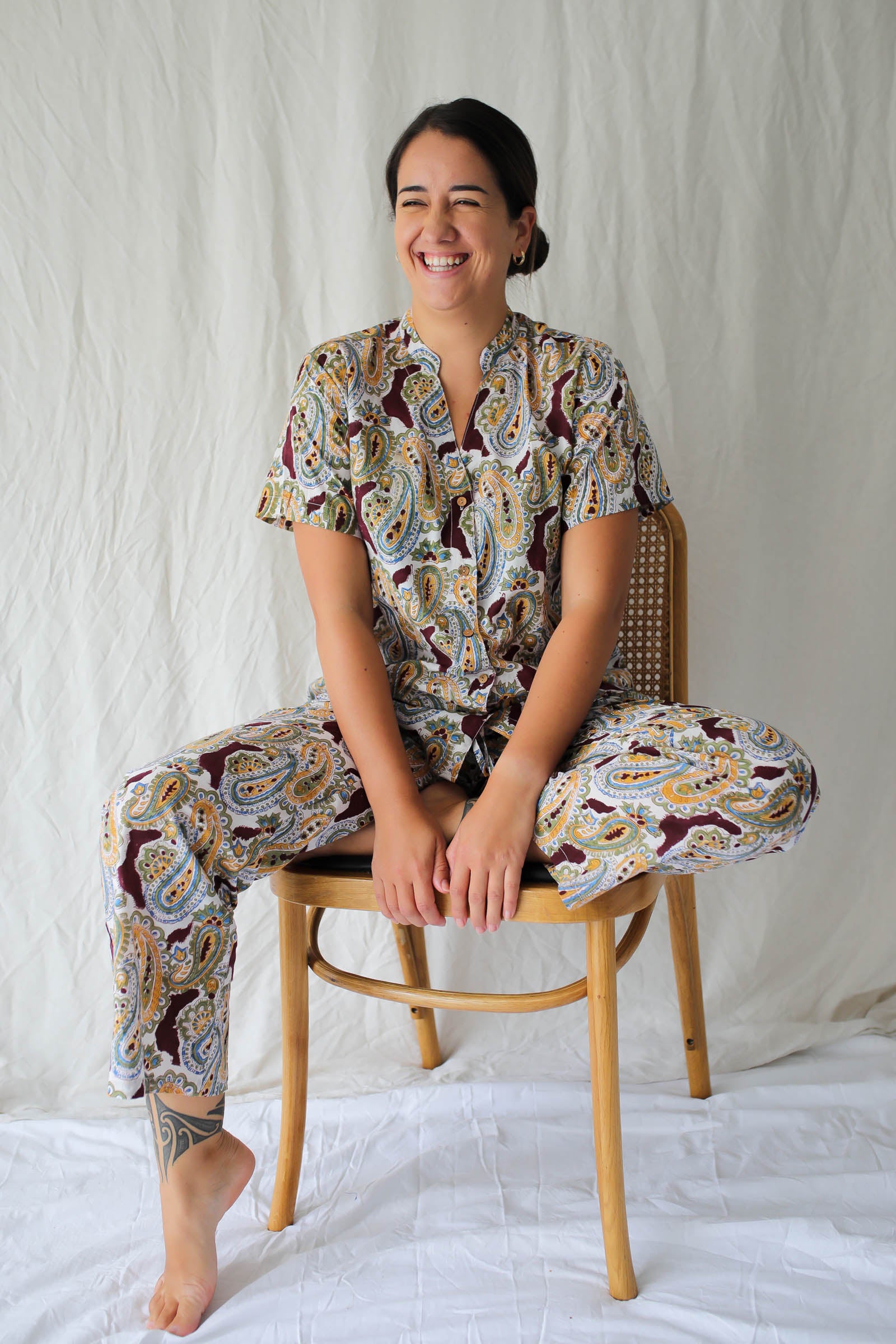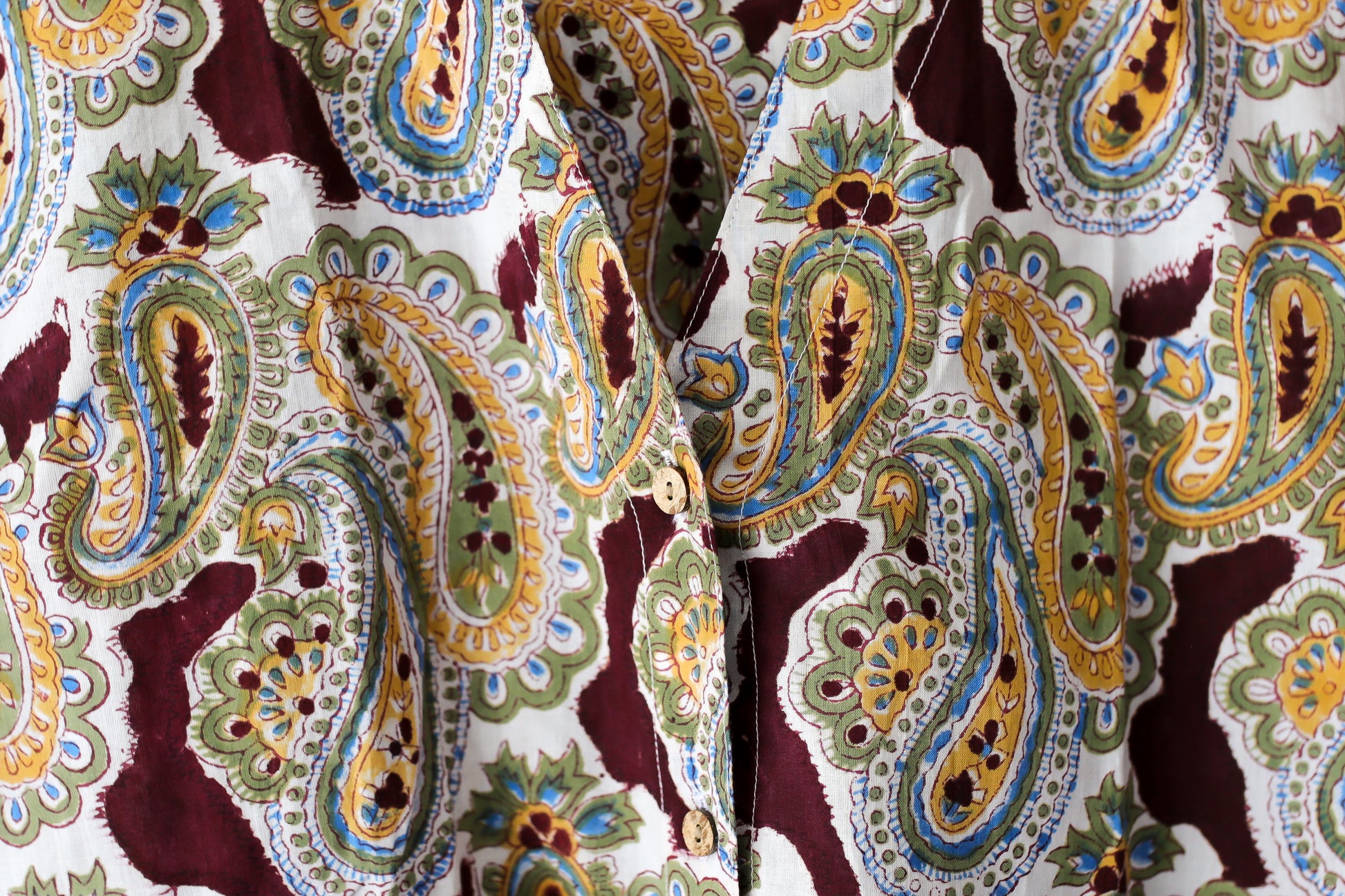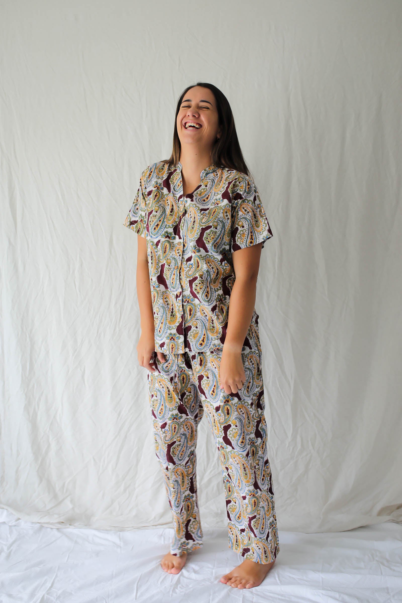 Featuring an elegant open neckline, button down front and short sleeve, paired with a comfortable long pant that includes pockets, this set is for the bold and sophisticated. Deep maroon paired with olive green, blue and a warm earthy yellow exemplify the sophistication, expertise and playfulness of the Indian colour palette.
