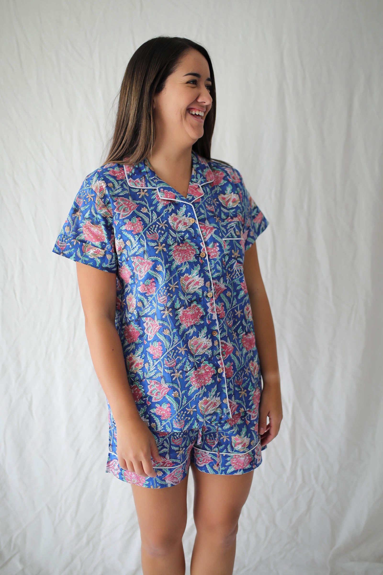 Our Gulshan pajama set is a classic cut button down style with short sleeve and shorts. It features comfortable elastic waistband with drawstrings for additional adjustability and crisp piping details. All inner seams are french-seamed for comfort and longevity and the buttons are made from natural coconut shell, inkeeping with our priority to center natural and sustainable materials.
