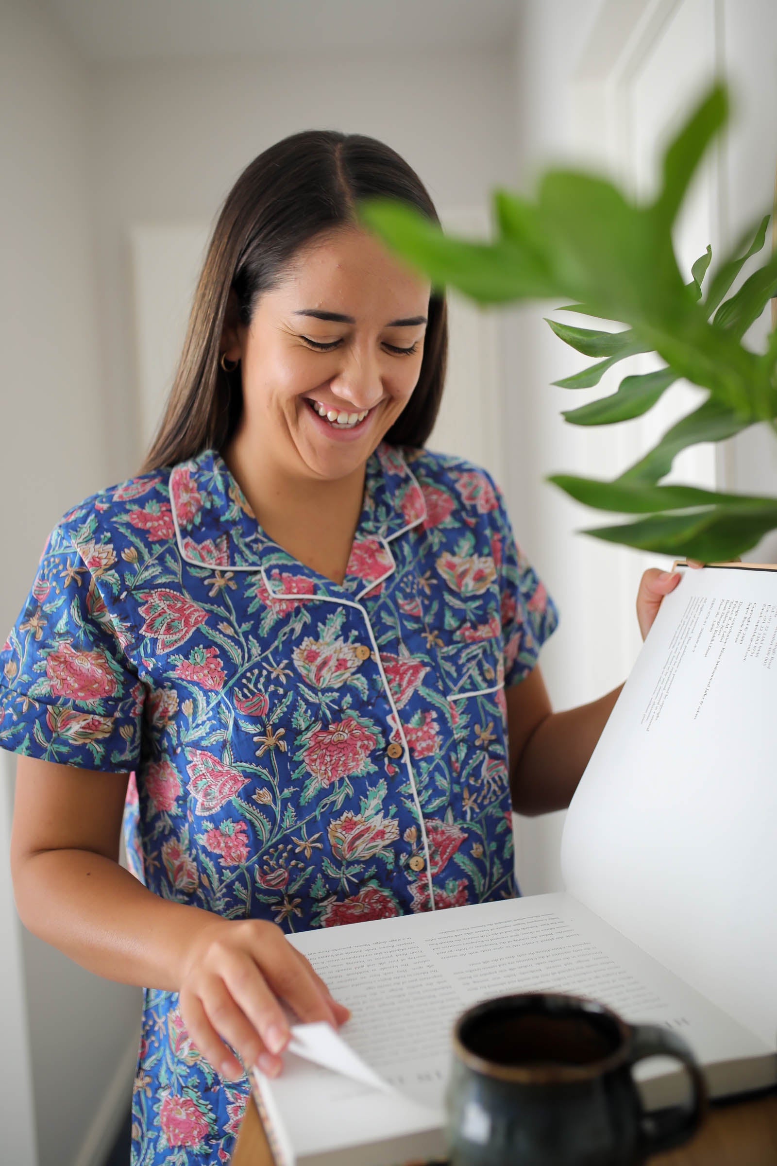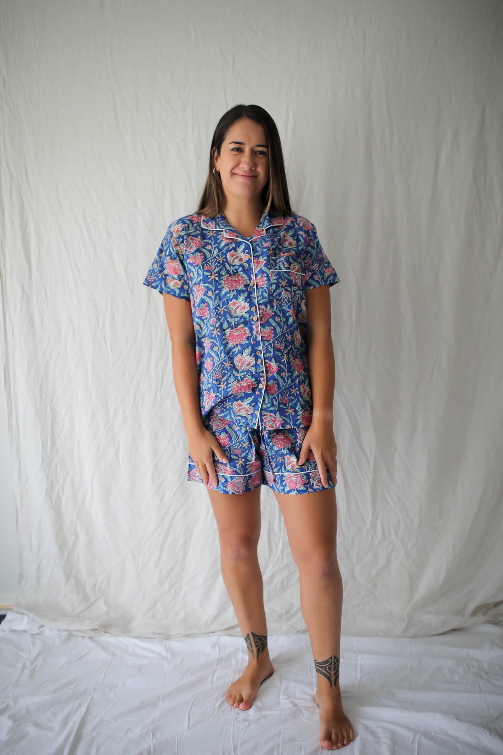 Crafted to embody the essence of natural beauty and joyfullness, this pajama set is made from exquisite Indian block-printed fabric, layered up using 5 seperate blocks, one for each of the colours in the palette.