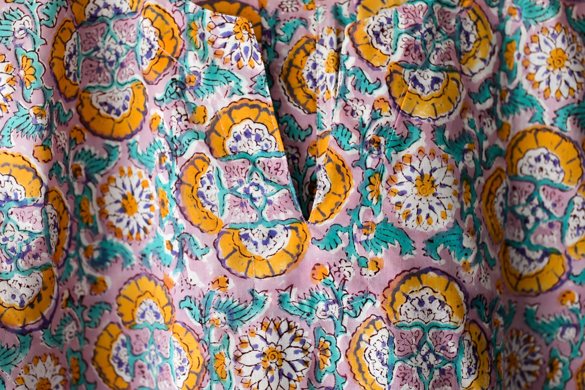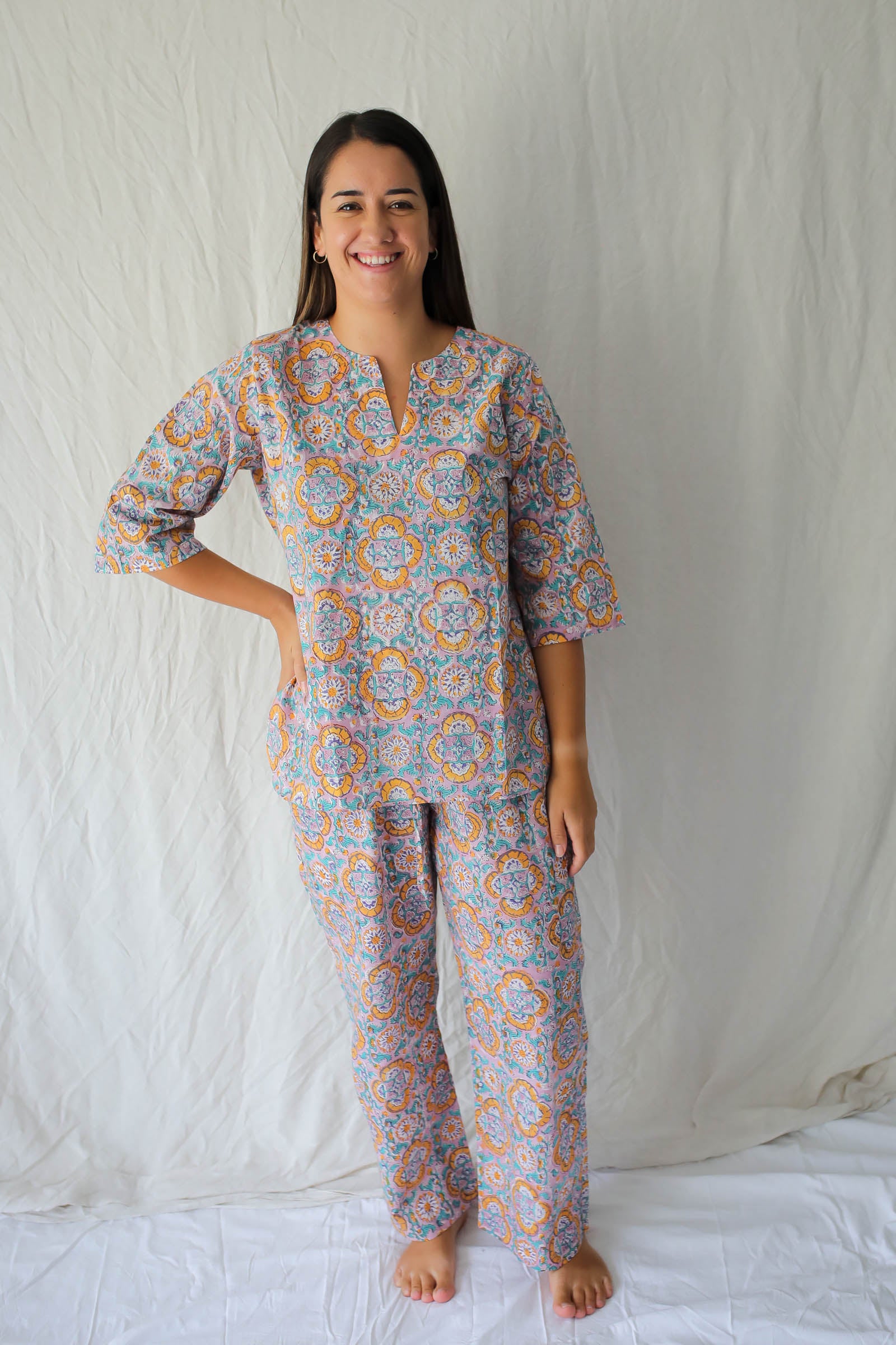 Reflecting its historical significance as both a medicinal herb and a cost-effective alternative to saffron, this piece embodies practical elegance. Crafted from premium Indian block-printed fabric, Kusum nightwear blends tradition with contemporary style.