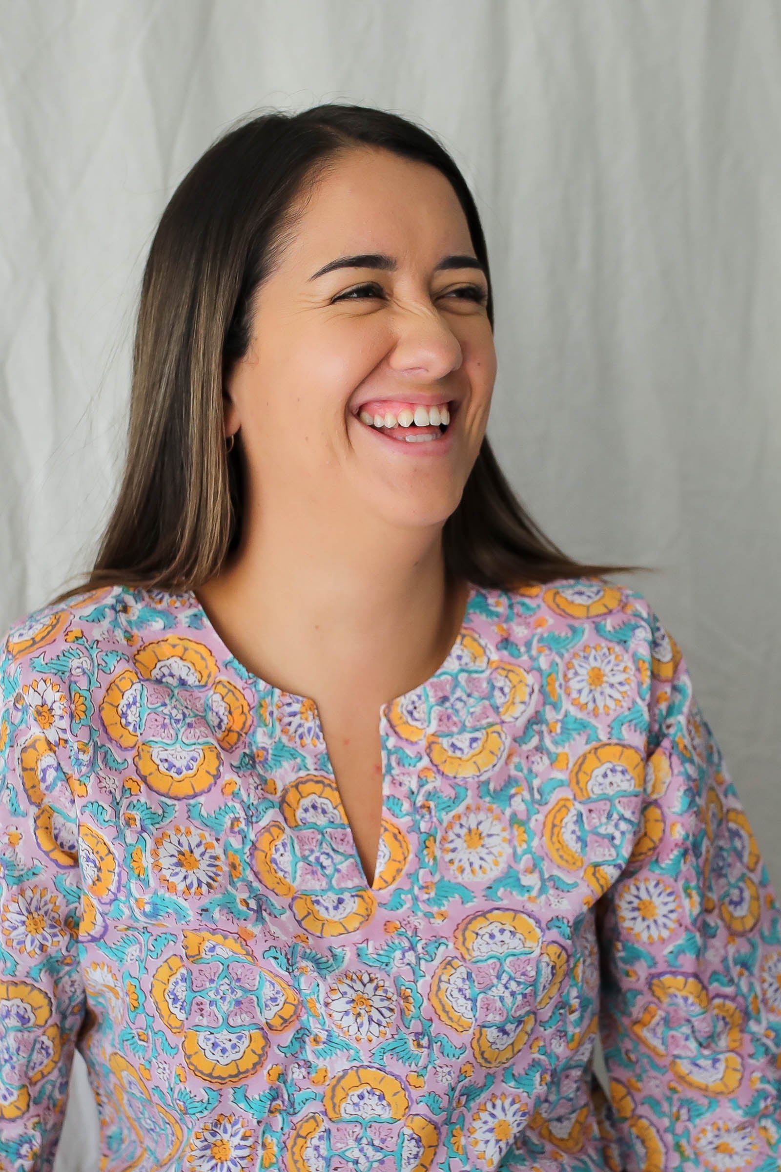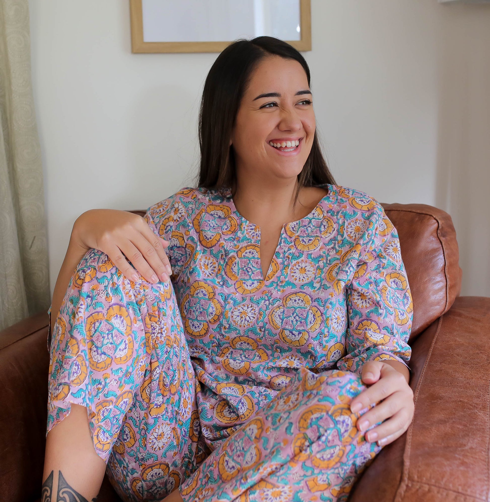 Our Kusum Pajama Set features a Kurta style top with long pajama pants with pockets. These pants feature pockets and all of our pieces are finished with french seams for comfort and longevity. All of our pajama sets are made from 100% cotton and hand block printed using non-toxic azo free natural dyes.