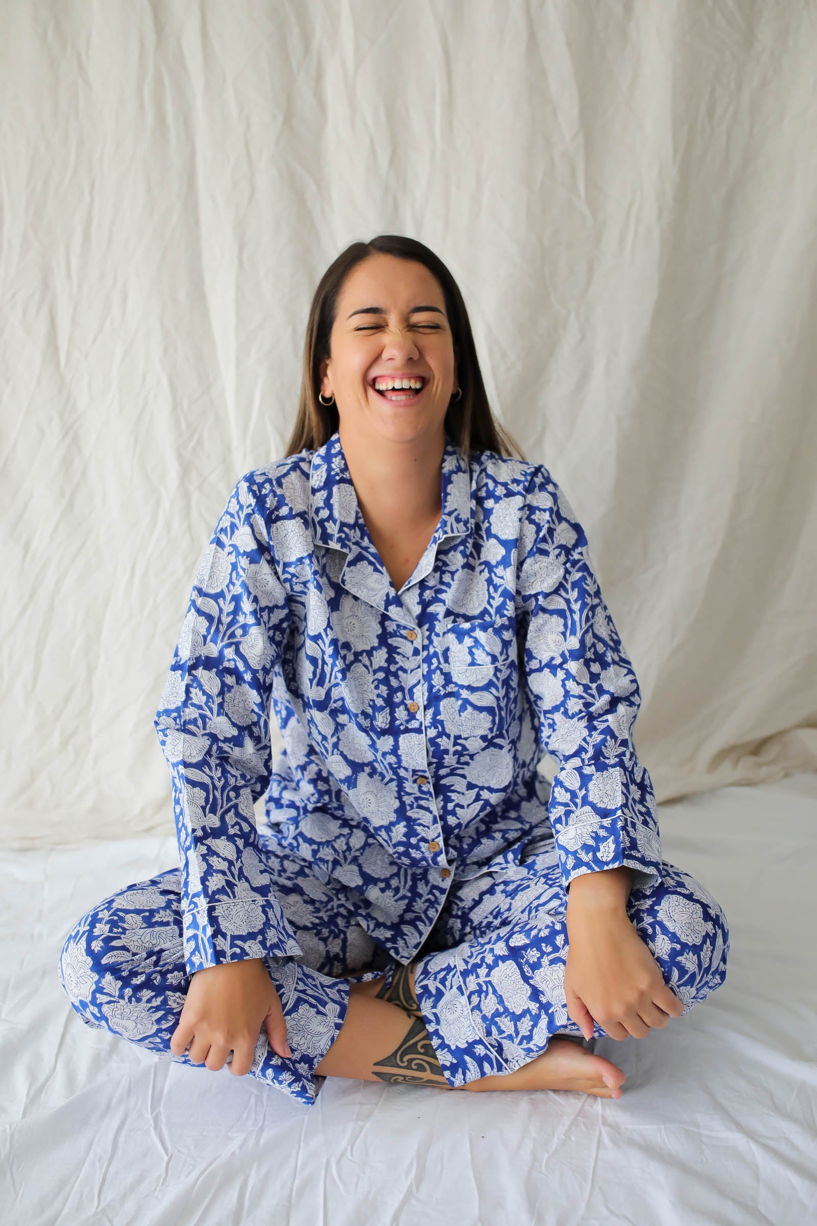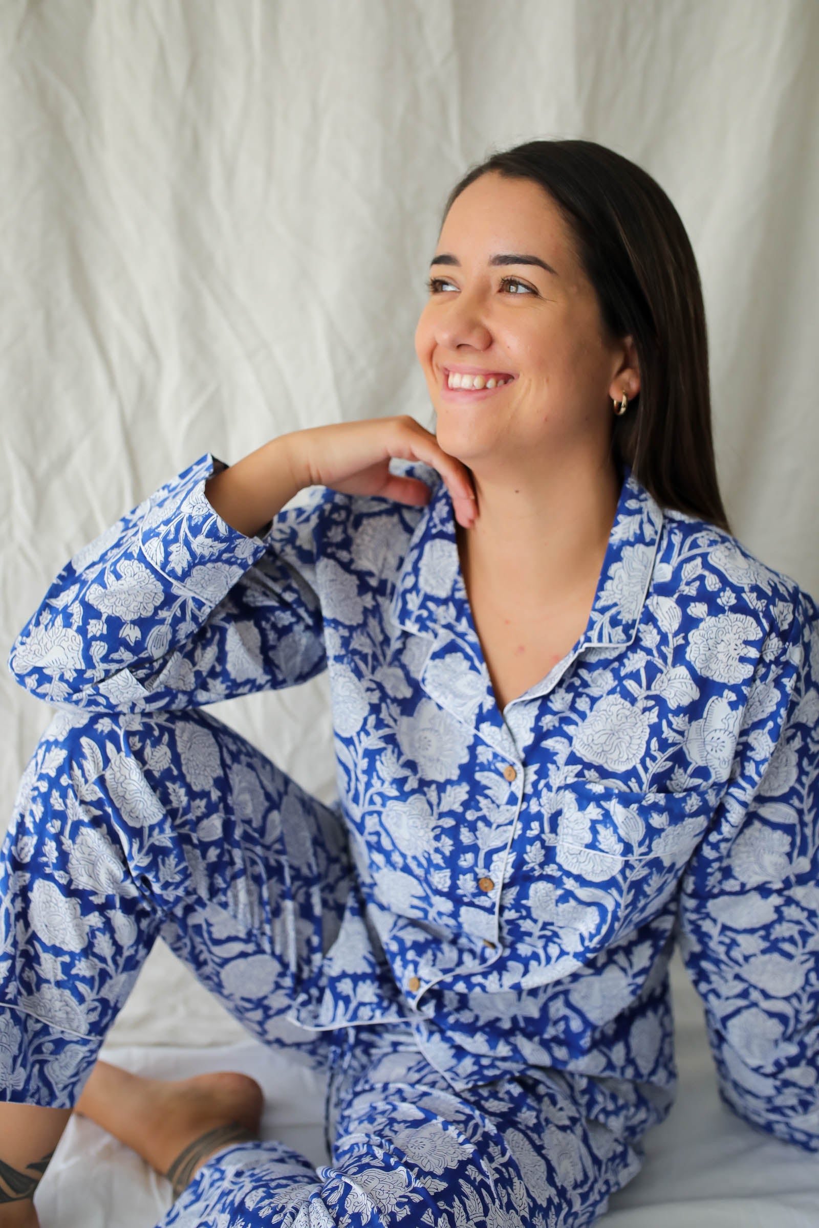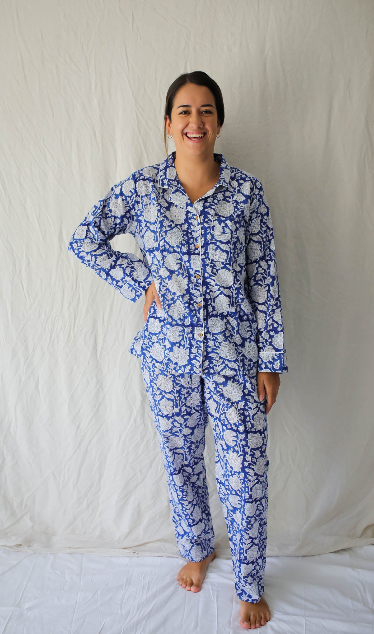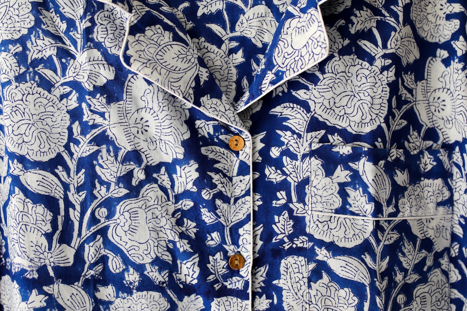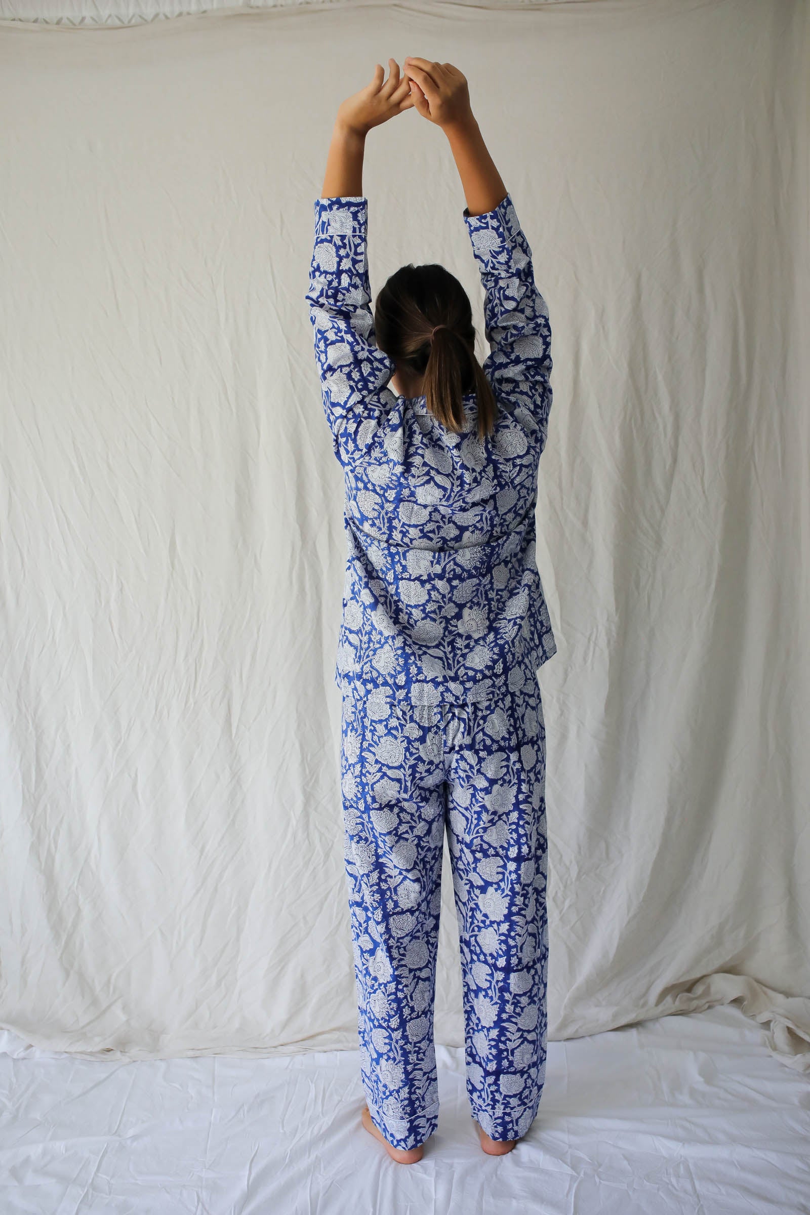Featuring a classic button down shirt and long pant, these pjs are for lounging. This set features pockets, crisp white piping, our standard french seams for ultimate comfort and longevity and coconut shell buttons. Made from 100% premium cotton and hand block printed by master artisans using AZO-free non-toxic dyes.