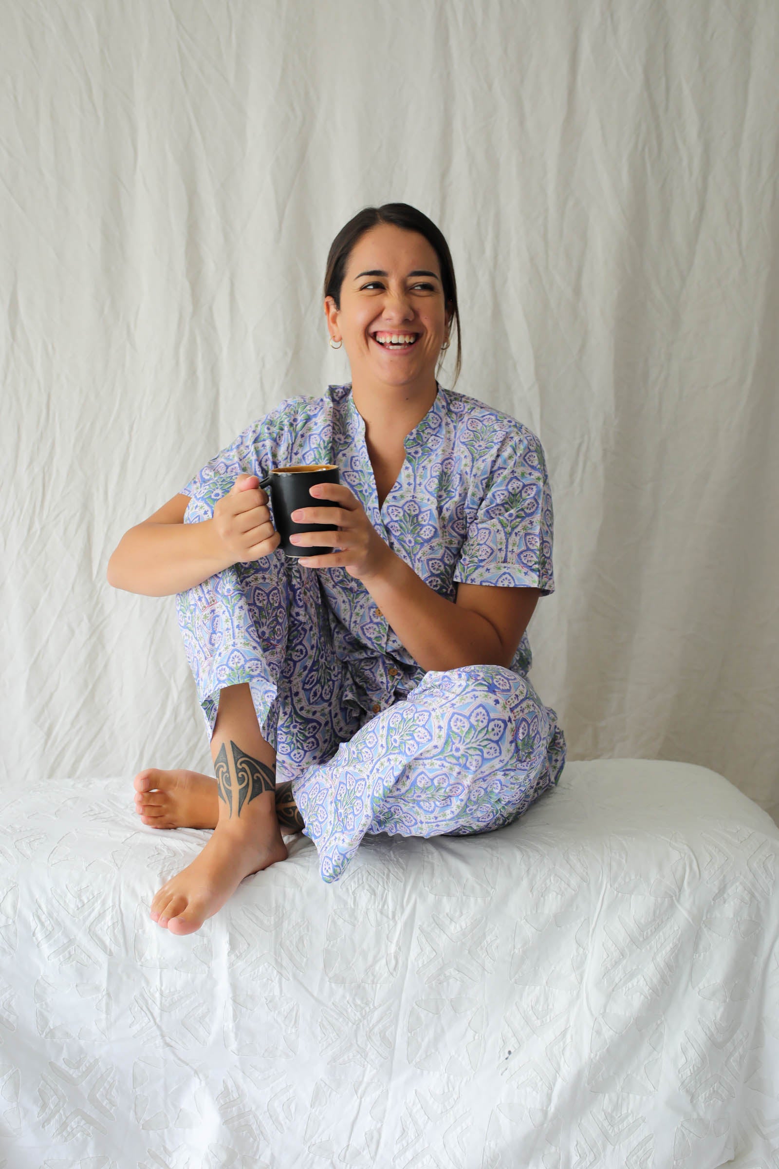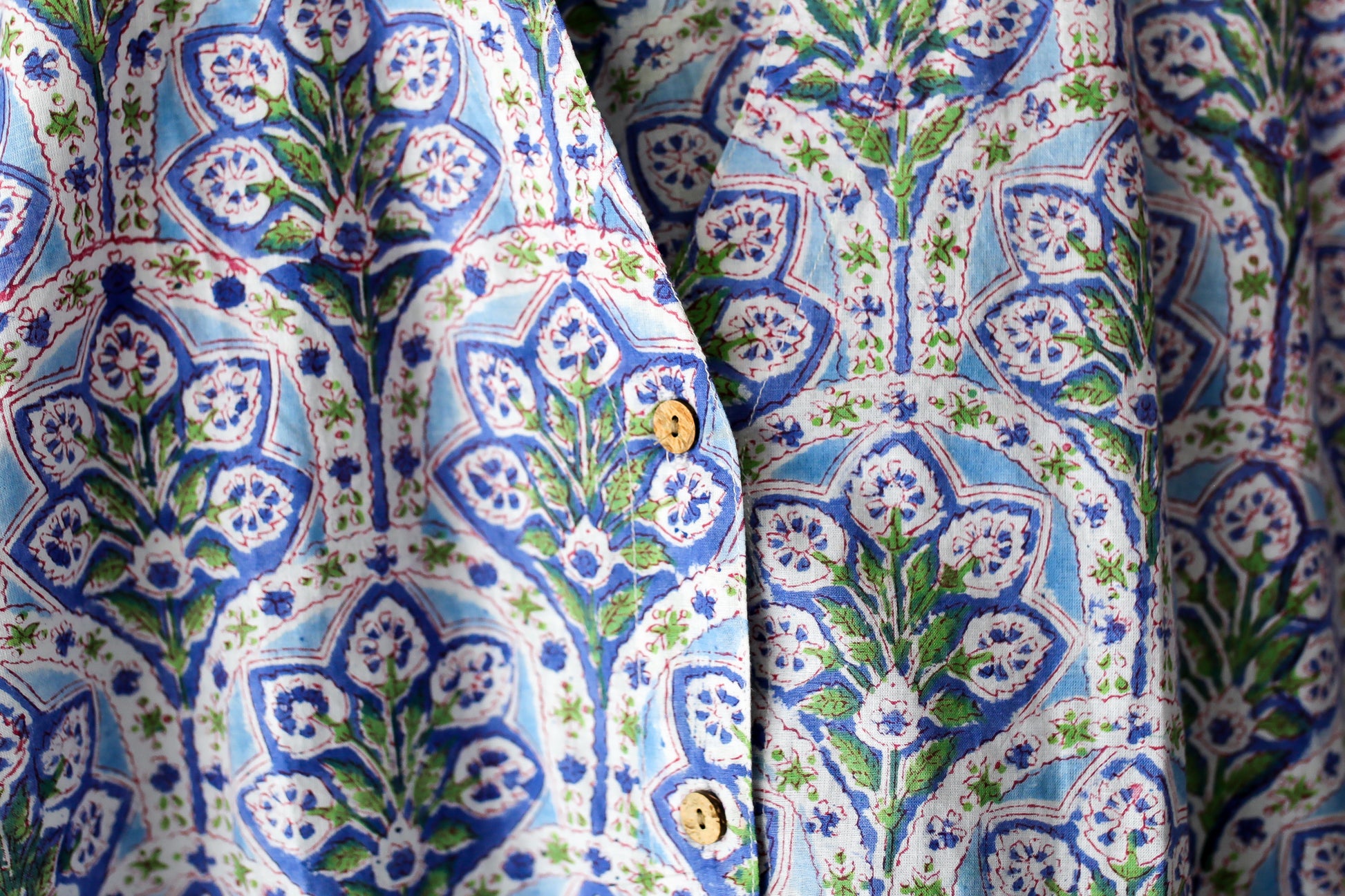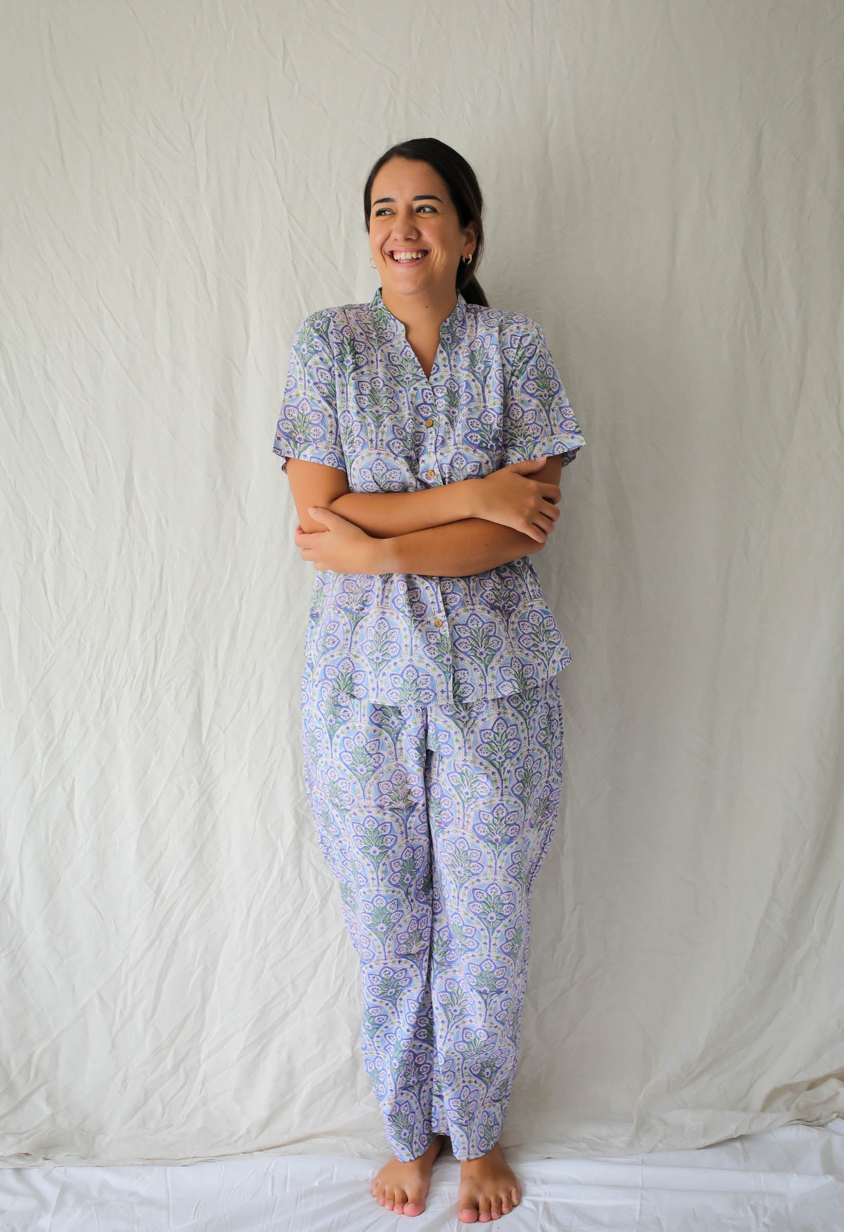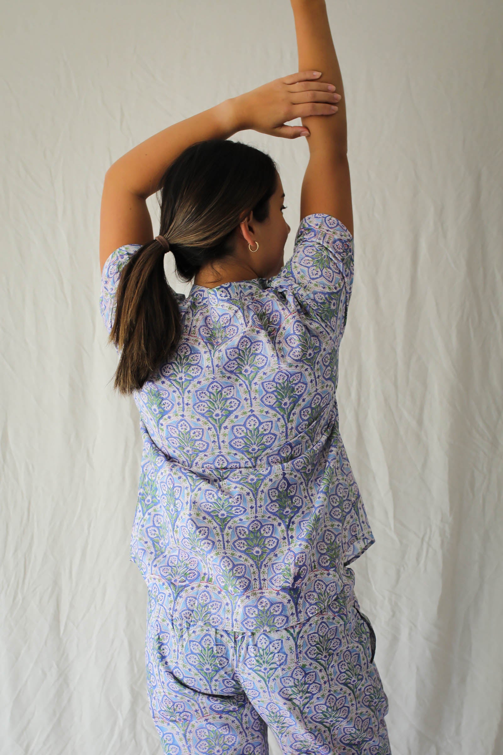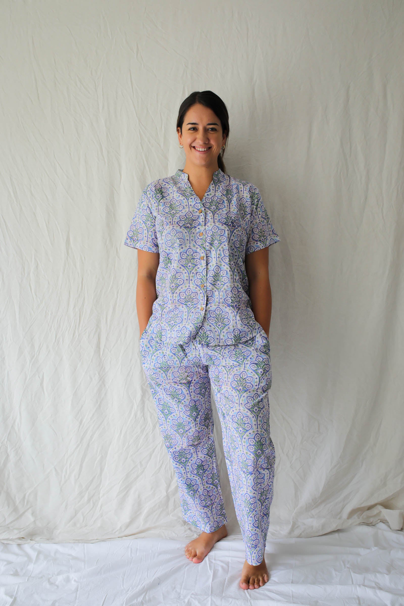 Crafted from the finest Indian hand block-printed fabric, Raatrani features a button down shirt and long pajama pant with pockets. Each seam is encased with french seams for comfort and durability and natural coconut shell buttons bring it together.
